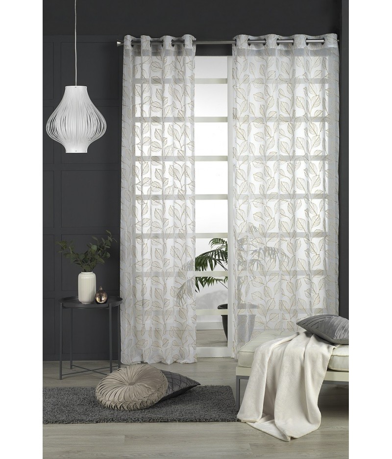 VISILLO ELEGANTE DECORATIVO CON HOJAS BORDADAS CON HILO METALIZADO, PARA DECORAR CUALQUIER ESTANCIA. SU MEDIDA ESTÁNDAR Y SU SISTEMA DE OLLAOS PERMITEN SU FÁCIL COLOCACIÓN.